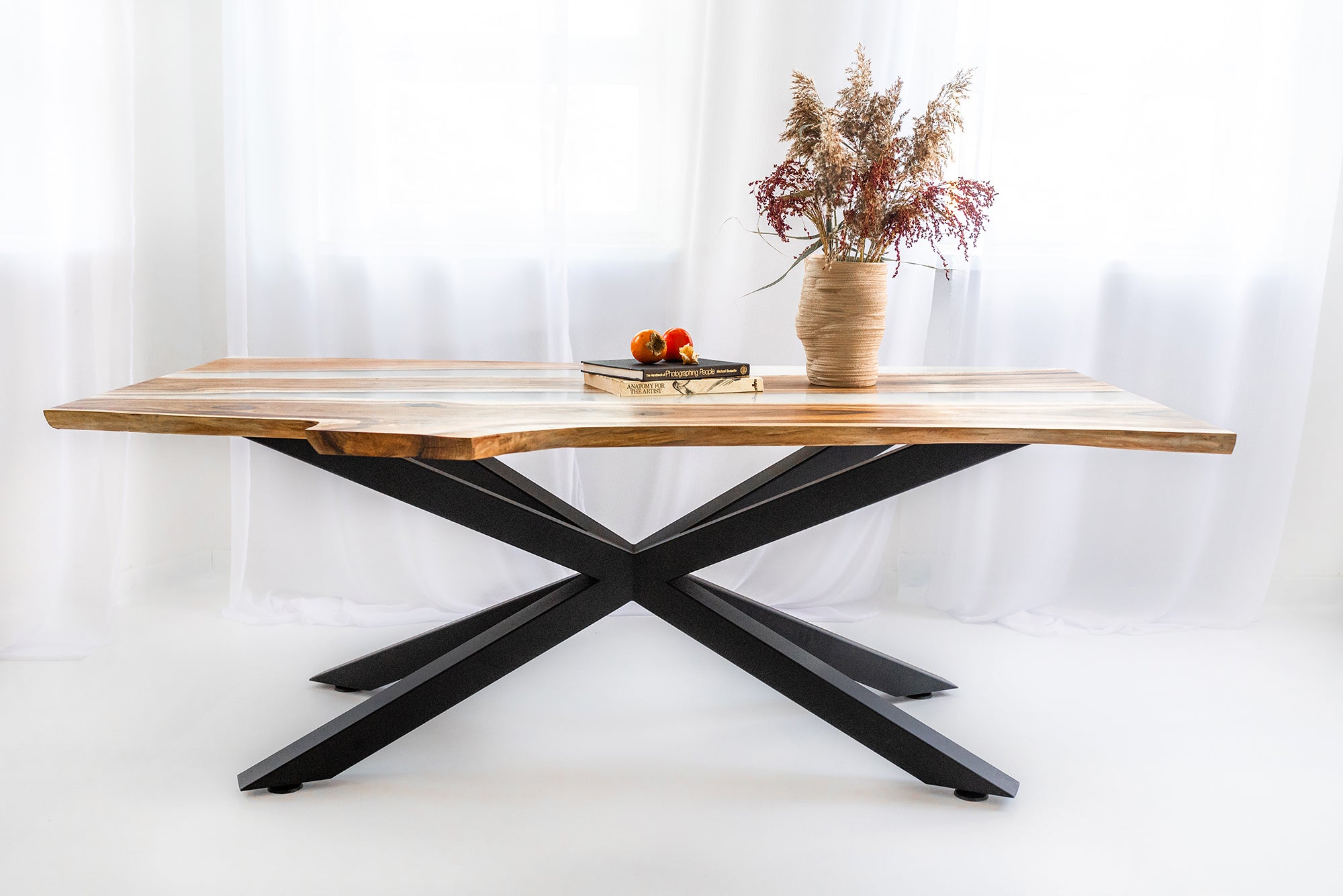 Das exotische Suarholz aus Indonesien zeichnet sich durch seine markante, natürliche Maserung und charmante Risse aus, die jedem Tisch einen unverwechselbaren Charakter verleihen. Diese einzigartigen Unvollkommenheiten verstärken den rustikalen Reiz des Tisches, feiern die organische Schönheit des Materials und machen jedes Stück zu einem wahren Unikat. Die einzigartige, natürliche Kante betont die handwerkliche Qualität des Tisches.